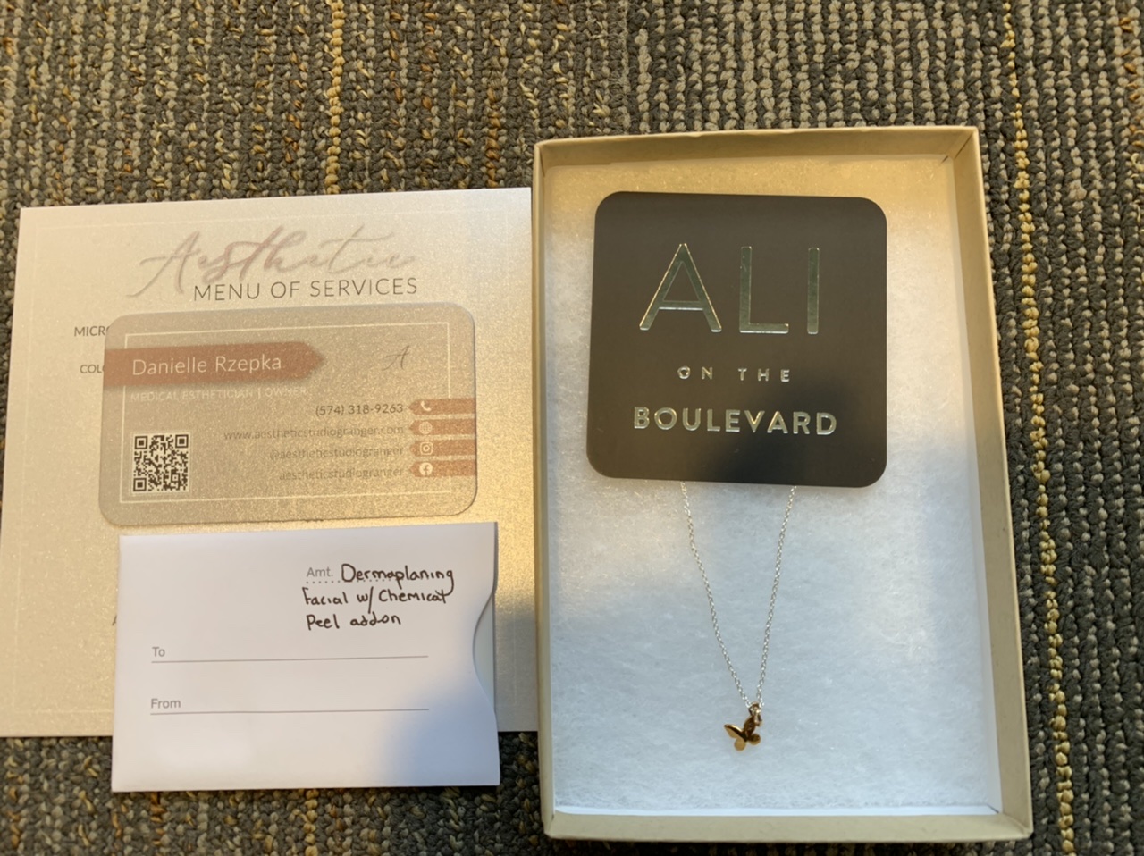 This package is a special treat for all you Beautiful Ladies! A unique one of a kind necklace from Ali's on the Boulevard and a Facial Dermaplane session at Aesthetic Beauty Studio.