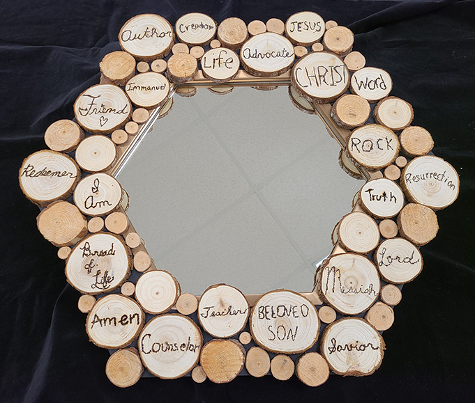 You can take home this hand crafted one of kind mirror from our 4th Grade class. This mirror incorporates 22 different names for Jesus, each individual name etched by one of our 4th grade students.